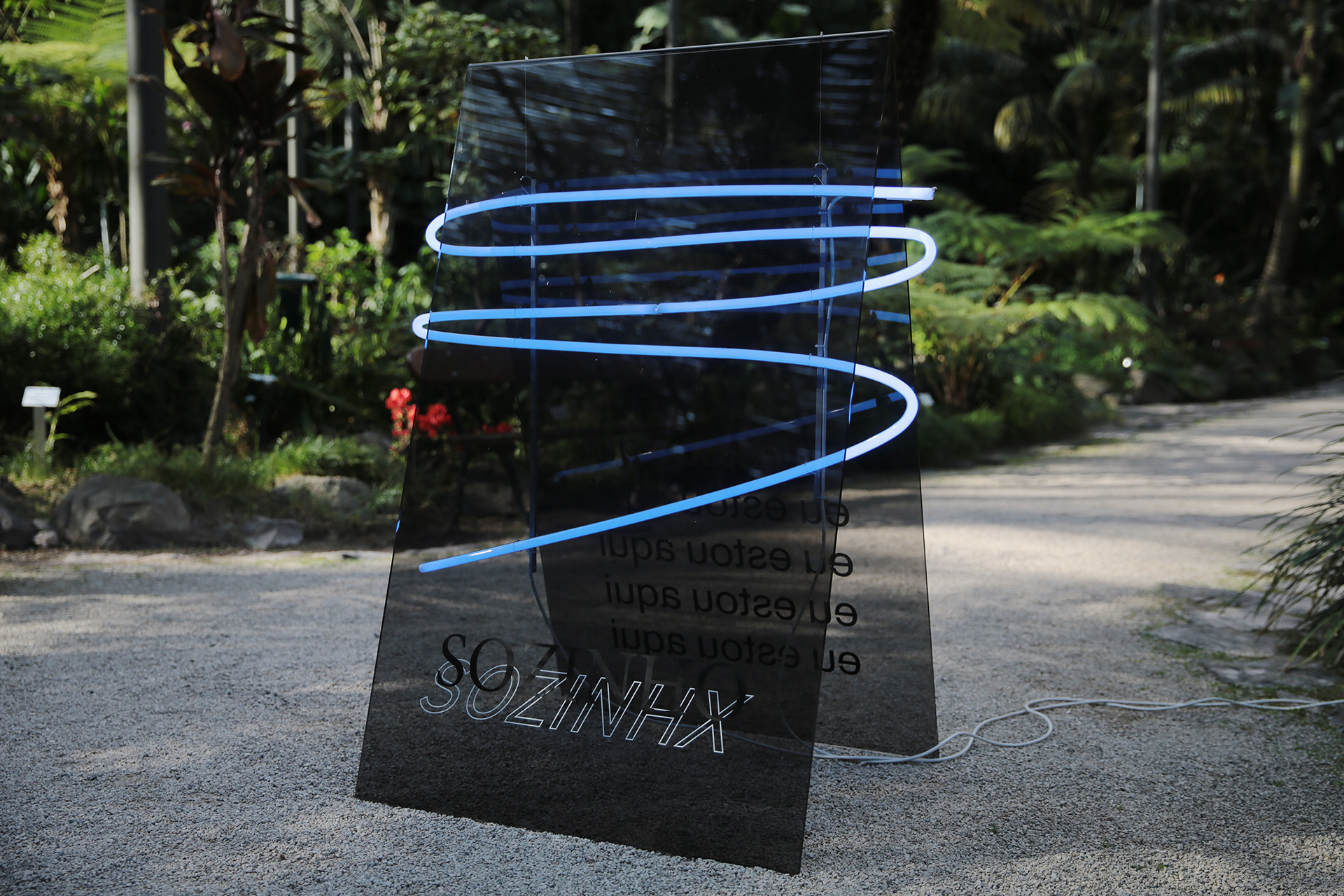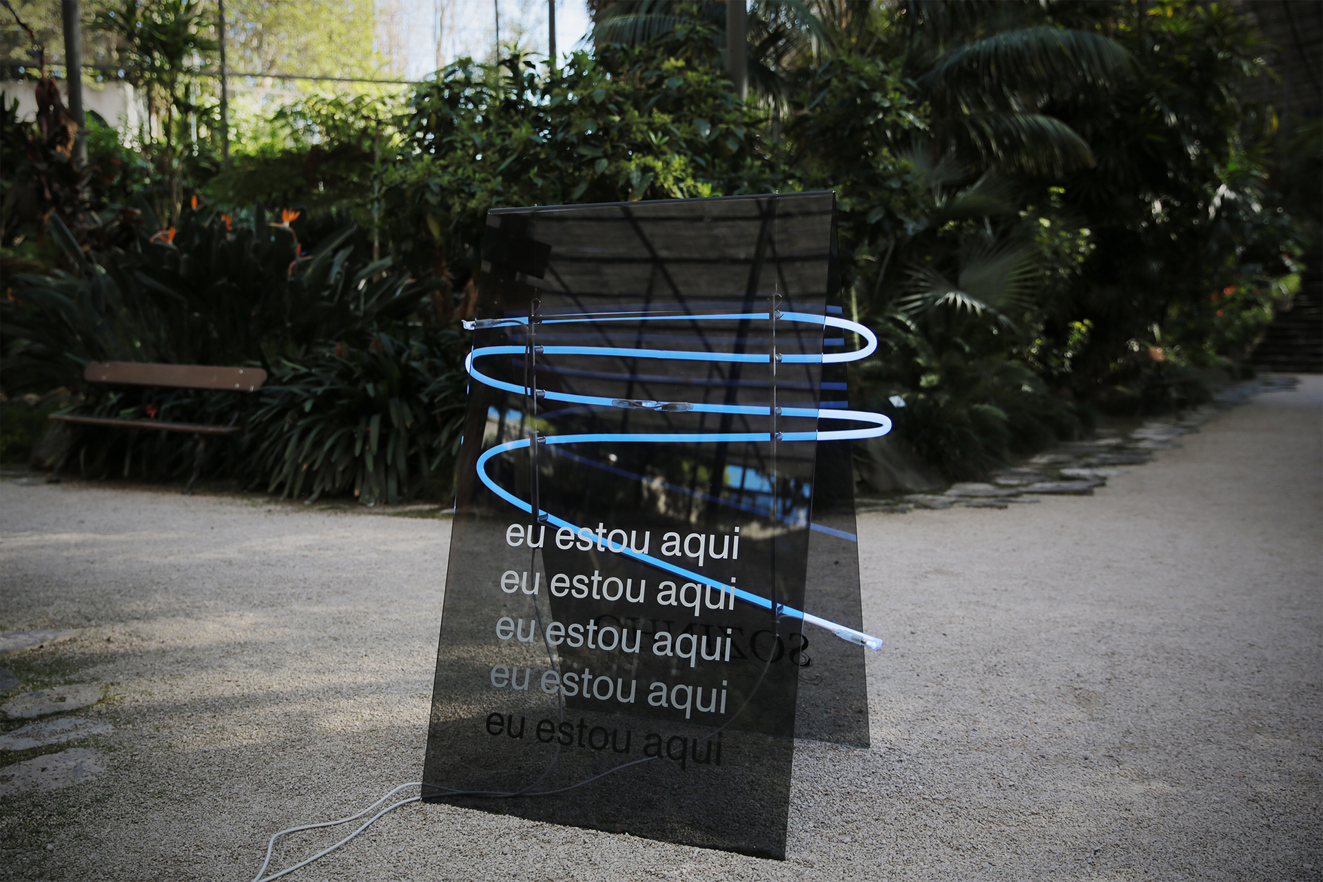 grey plexiglass, laser cut vinyl, neon, metal structure, 125x80x100cm, 2019